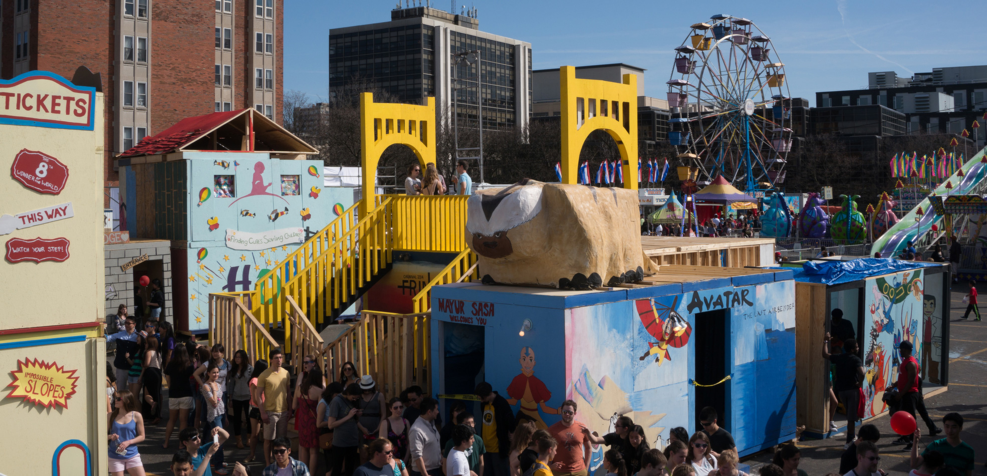 The different teams push their buggies through tight turns and sharp hills, showing off both engineering and teamwork. The final races give the carnival a sense of drama and spectacle you don’t usually associate with academics. Student groups also build elaborate, multi-story Booths, each a themed structure that takes weeks to complete. Carnival weekend is packed with rides, games, and a busy crowd of students, families, and alumni.