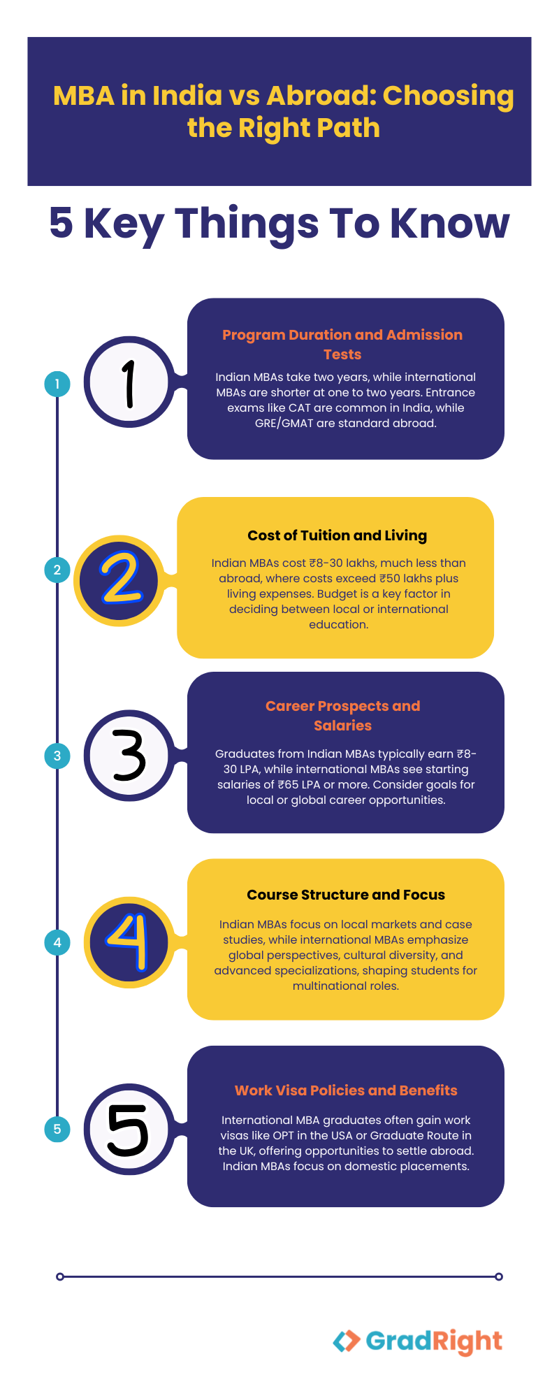 Choosing between an MBA in India and an MBA abroad depends largely on your career aspirations. If you aim for a global career with multinational companies, an MBA abroad is preferable due to the wider exposure and international network it provides.